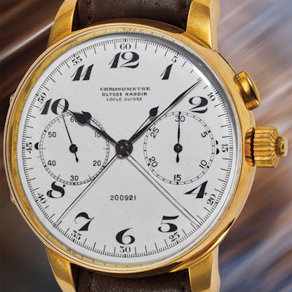 A Ulysse Nardin Oversized Rattrapante Chronograph, With Guillaume Balance. For most of us, the name Ulysse Nardin conjures first and foremost, the groundbreaking carousel wristwatch known as the Freak, but the company’s history goes back much, much further, and includes not only the revolutionary astronomical complications designed for UN by Dr. Ludwig Oechslin, but also, since the company’s founding in 1846, the production of highly regarded marine chronometers, and complicated watches as well. This example is one of them – a rattrapante (split seconds) chronograph, completed in 1915, which is an astonishing 52mm in diameter (it is according to the catalog notes, the largest rattrapante wristwatch ever made) and it is not a pocket watch conversion – the movement was originally cased as a wristwatch.