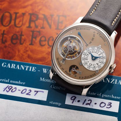 An F.P. Journe Fourth Series Tourbillon Souverain. Modern independent watchmakers often establish their reputations with high quality, beautifully designed simple watches. A quarter century ago, though, F.P. Journe established his reputation with complicated watches and to this day, his Tourbillon Souverain and Chronomètre à Résonance still define the essence of his watchmaking for his many collectors, and for the entire enthusiast community. This “fourth series” is the last of the original Tourbillon Souverain models before Journe completely redesigned his tourbillon, with a hidden remontoire but with visible deadbeat seconds, in 2004. At this point in the history of watchmaking, wristwatch tourbillons were far rarer than they are today, and of course, nobody before Journe – nobody – had ever combined the tourbillon with a constant force remontoir in a wristwatch.