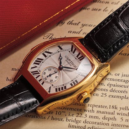 A Cartier CPCP Tortue Minute Repeater. Cartier is not often thought of as a maker of complicated watches and that is partly by design – especially in the last ten years or so, the company has reaffirmed its long-standing credentials as a maker of simple watches with case and dial designs that are anything but simplistic. However, through its long history the company has produced some wonderful complications and when you combine an aristocrat like the minute repeater, with a classic case design like the Tortue, you get a winner. The repeater has the additional advantage in terms of showcasing design, that it gives up very little in clarity and simplicity to a time-only watch – unless the dial is opened, the incredible ballet of racks, levers, and gears underlying the chiming of the time makes itself known only by its song, like a nightingale hidden among the branches.