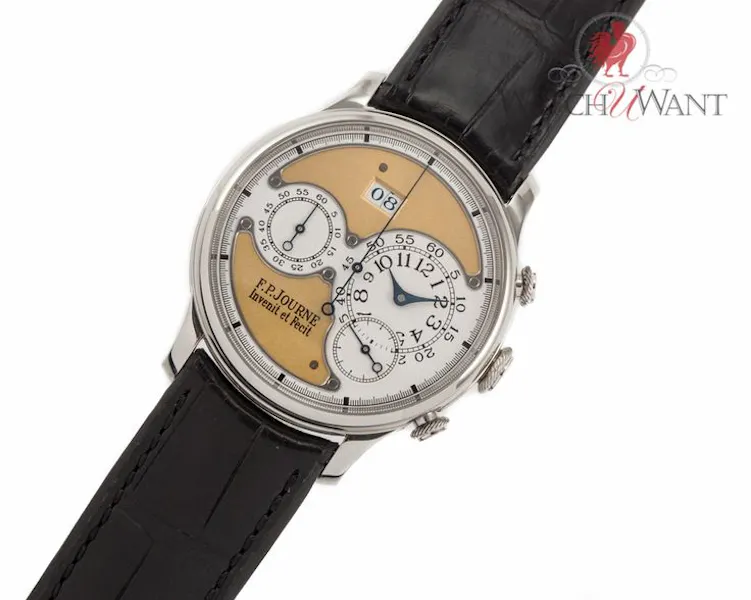 The F.P. Journe Octa Chronograph was available with a suite of options that permitted each buyer to tailor his order. This example features the more traditional 38mm case (Journe’s preference), the rare yellow gold dial inserts, and the platinum case (rose gold was an option).