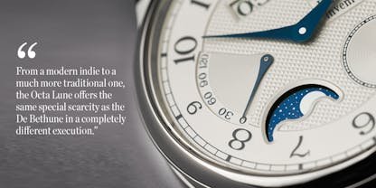 From a modern indie to a much more traditional one, the Octa Lune offers the same special scarcity as the De Bethune in a completely different execution. Its engine turned dial displays simple indications for time and power reserve alongside a traditional moonphase disc. In the case of this example, a rose gold moon is used to match its rose gold case. This isn’t where the gold glory stops; flip its case over and you’ll see that this Octa Lune’s automatic movement is made entirely of rose gold as well.