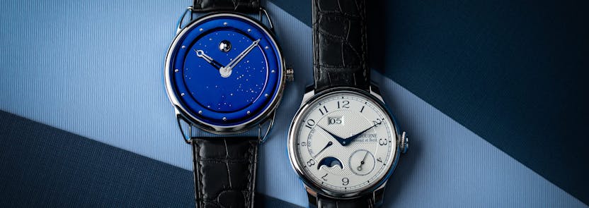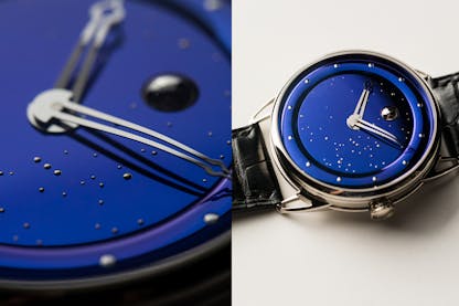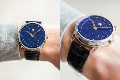 There’s no denying that I have a soft spot for all things De Bethune, and even though they’re not especially known for their moonphase complications, it’s something they execute beautifully. Using a three-dimensional polished sphere, the DB25 breaks away from the standard convention of moonphase indication. This particular version that places the moon against a star-filled sky, paints an artistic picture that’s easy to fall in love with, all while being powered by one of the brand’s elegantly finished calibers. The manually wound white gold piece measures 44mm across, though with short lugs, it wears a bit smaller than one would expect.