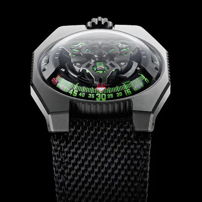Those orbital functions have been used by URWERK before in its watches – the UR-100, specifically, which comes in several variations and which shows how far the Earth has traveled in its orbit, and the distance that it has rotated at the equator, over 20 minute periods (this is a secondary function of the time satellites which under ordinary circumstances, basically have no function until they rotate back into position in the actual wandering hours display).