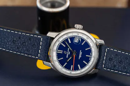 One hesitates to say nowadays that a watch “pops” in the same way that I hope restaurant critics hesitate to say “cooked to perfection,” but what can I tell you; the watch pops. The orange seconds hand against the deep blue dial gives some great contrast, which I think the saturation of the dial demands; the blue is deep enough that without a strong contrast it would probably overwhelm the rest of the dial and feel a little heavy. Orange on blue adds some drama to what might otherwise be a slightly self-effacing design; it’s like a flicker of heat lightning on a summer night.