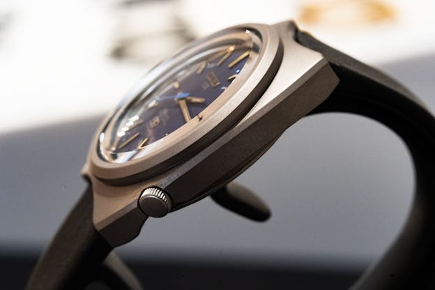 Titanium has become ubiquitous in modern watchmaking, and with good reason. It’s a nearly ideal material for watch cases; in general it has a higher strength-to-weight ratio than steel, making it more comfortable to wear (especially in larger watches) and it’s hypoallergenic, which is a big plus for anyone with a contact allergy to the nickel found in stainless steels. It’s also highly resistant to corrosion (titanium naturally forms a layer of surface oxides, which prevents any further oxidation of the bulk metal). It is, however, more difficult to machine than steel; titanium conducts heat poorly, which means temperature during machining has to be carefully controlled, and titanium also has a tendency to gall – that is, it tends to build up on the cutting edges of machine tools. It’s also very difficult to produce a consumer-ready, polished surface, and titanium is also softer than steel and unless it’s given a surface hardening treatment, it scratches much more easily than stainless steel. For all of these reasons, titanium became a commonly used metal for watch cases only gradually, and fairly late in the history of watchmaking – the first watch with a titanium case didn’t appear until 1970, when Citizen launched the X8 Chronometer.