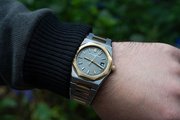 The 50th Anniversary Laureato despite its resemblance to my GP madeleine of nostalgia, the 8101, different in some subtle but significant respects. The most noticeable if you’re looking at specific differences in the details, is in the handling of the transitions from case top to case flank; in the 8010, edges in general are slightly rounder and there is a little bit more of a biomorphic feel, which goes along with the rounded gold interlinks, which in turn project proud of the surface of the bracelet. The 50th Anniversary when it comes to bracelets, actually feels a bit closer to the 1975 model, with its interlinks effectively on the same plane as the steel links.