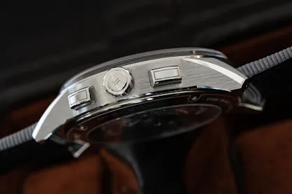 Case construction is excellent as well. The box sapphire crystal sits on top of a very narrow bezel and the lugs and case middle are crisply finished, with brushed finishing on the lug tops and sides and horizontal brushing on the case middle. The transitions between the mirror polished facets of the case and the brushed finish tops and sides are very sharp and clean, and the high level of polish on the chrono pushers and crown contrasts beautifully with the brushed finish on the case middle proper. Water resistance is 100 meters. The relatively short lugs make the watch pretty versatile in terms of fit onto different diameter wrists.