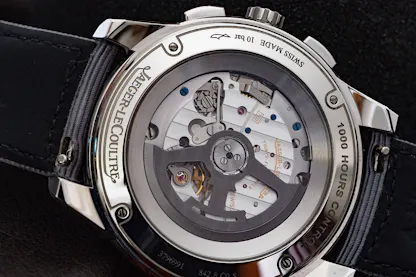 Caliber 761 is as we’ve mentioned, a development of the three register caliber 751, and it is currently used by JLC only in the Polaris chronographs. It’s an integrated chronograph movement, with a freesprung, adjustable mass balance, running at 28,800 vph in 35 jewels, with a 65 hour power reserve delivered out of double mainspring barrels. At 25.60mm x 5.76mm, it is not much thicker than some workhorse automatic calibers (the ETA 2824-2, for instance, is 4.6mm thick with a 38 hour power reserve).  The  movement and the entire watch go through JLC’s 1000 Hour Control series of tests (Jaeger-LeCoultre first introduced this testing regimen for the Master Control collection in 1992, and then expanded it to include every collection). The tests take six weeks, and includes testing for precision in six positions, as well as tests for functionality, power, reserve, and resistance to magnetic fields.