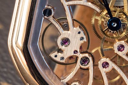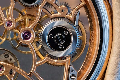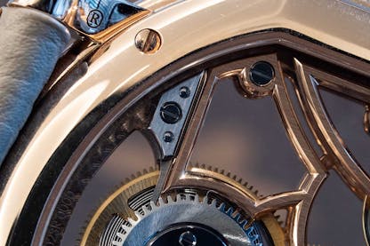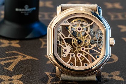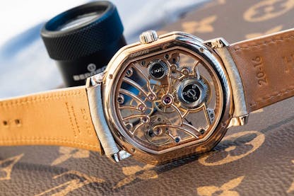 The level of finishing is very high and there appear to have been no shortcuts taken anywhere in either the design of the movement or the finishing of the many bevels of the openworked mainplate and movement bridges. The anglage of the plate and bridges is mirror polished, with the flat upper surfaces straight grained on both sides; the keyless works as well are straight grained with polished flanks and bevels, and train wheels are all circular grained; the spokes of the train wheels are beveled and polished as well. Daniel Roth says that there is only one person at Louis Vuitton La Fabrique du Temps who is qualified to assemble the movement, which may seem surprising at first as this is after all a time-only watch; you would expect such restrictions to be more likely to obtain with a watch with complications, like a repeater or perpetual calendar. The issue is apparently that the movement is so highly polished that the slightest scratch would be instantly obvious and easily visible, so assembly is time consuming and requires great care and unflagging attention from the watchmaker.