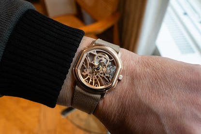 One of the basic criteria for evaluating an openworked or skeletonized watch, is the degree to which the watch is transparent and on that criterion the DR Extra Plat Rose Gold Skeleton scores very high – it’s not quite as perilously whisper thin as some historic skeletonized movements, but it’s close, and in this case I think the fact that the bridgework is slightly thicker than you’d find on some legacy skeletonized watches, is an advantage; you get transparency without the metal looking so perilously thin that you begin to fear for the health of the watch.