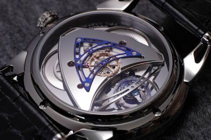 And the third purpose? Triple Pare-Chute looks cool. Early iterations employed a polished flat bridge with excellent mechanical qualities but aesthetic shortcomings. The definitive De Bethune balance bridge has emerged with a set of rounded arms whose diameters taper as they approach the flanking springs. Fully rounded and mirror-polished bridges are the preserve of the world’s most elite watchmakers. De Bethune’s workshop in L’Auberson proves itself equal to the most exacting bienfacture of Geneva, Neuchâtel, La Chaux-de-Fonds, and the Vallée de Joux.