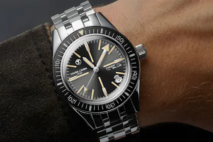 The Deep Blue Revival is powered by a La Joux Perret automatic caliber G100, and at launch there will be one model, with a black sunray brushed dial and ecru vintage-style lume. Price is CHF 2250.