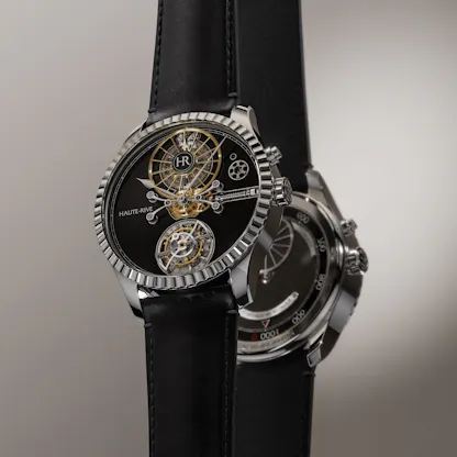 The Honoris I 41 Day Flying Tourbillon: Cases, available in 18k white or yellow gold, with openworked grand feu enamel dials in white or black; 30M water resistance, 42.5mm x 11.95mm. Sapphire crystals, AR coated, front and back. Movement, HR01 caliber, hand wound via a rotating bezel with single mainspring barrel with 3 meter long mainspring; “mysterious” flying tourbillon rotating once per minute; lever escapement, variable inertia balance wheel; 38.45mm x 7.75mm, running at 18,000 vph in 35 jewels. All bevels hand finished in the traditional fashion with gentian wood from the Jura. Matching 18k gold pin buckles. Price at launch, CHF 148,000. For more info, visit Haute Rive online.