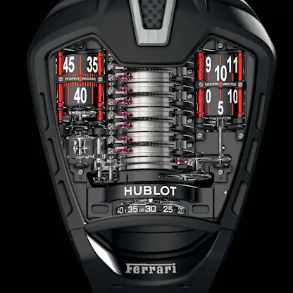 Generally speaking, making a watch with a very long power reserve, comes with unconquerable technical limitations. To run a watch with a power reserve close to or exceeding a month, you have no choice but to either use multiple mainspring barrels, or a smaller number of very long mainsprings. One pioneering example is the Jacob & Co. Quenttin vertical tourbillon, which set a world’s record in 2006, with a 31 day power reserve, which required seven mainspring barrels. The Lange 31 has two very long mainsprings, 1850mm in length each (according to Lange, about twice the length of a typical watch mainspring) and makes use of a train remontoire in order to even out the torque at the extreme ends of the power curve. Vacheron Constantin’s Twin Beat has an even longer power reserve – 65 days, but this is only if the watch, which has two oscillators, is in standby mode, using the balance that beats at just 1.2Hz. The watch with the longest power reserve ever, the all-time champion, is the Hublot La Ferrari, first delivered in 2013, which has a fifty day power reserve, seven mainspring barrels, and a case that looks as if it were inspired by Darth Vader’s helmet – to ease the strain on your fingers it comes with an electric screwdriver-like winding tool.