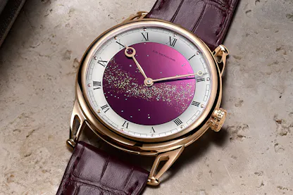 The De Bethune Starry Varius “Volcano” ref. DB25VxsTiV2 (titanium) or DB25VxsRV2: cases, polished grade 5 titanium or 5N rose gold, 40.6mm x 8.8mm, with burgundy-tempered titanium dials decorated with white gold stars and laser micro milled Milky Way patterns, gilded with 24k gold leaf. Water resistance for both watches, 30 meters. Movements, caliber DB2005, running at 28,800 vph in 27 jewels; power reserve, 6 days from double mainspring barrels. Titanium balance with white gold inserts; self-centering De Bethune flat balance spring; silicon escape wheel. Prices, $80,000 in titanium, $85,000 in rose gold.