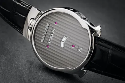 The first version of the DBD was released in 2006, and derived its design from several influences, including the digital and in-line perpetual calendars produced during the Art Deco period, including pocket watches and wristwatches by Cartier and Patek Philippe. Many of De Bethune’s designs have been notable for dials which open up the interior of the watch and put the mechanism on full display, but some of DB’s most successful designs, such as the DBD and DB28 Digitale, make a virtue of simplicity, and use the generous amount of dial real estate to emphasize the relationship between a few carefully chosen elements.