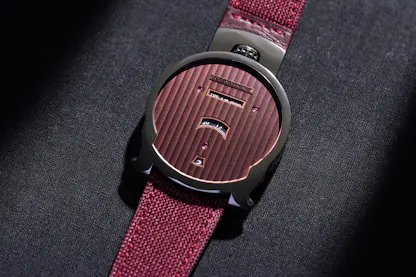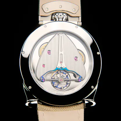 The basic case shape is a sort of modified pocket watch design,with the crown at 12:00 and an asymmetrical lug system, articulated at the top and with the lower lugs in the modified ogival shape that characterizes so many De Bethune case designs. Earlier this year, De Bethune introduced a new version – the Season 2 – in collaboration with musician and producer Swizz Beatz, with a burgundy dial.