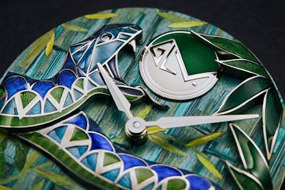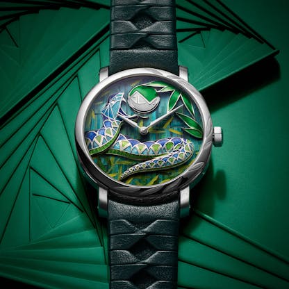For a few years in the mid-2000s several different brands showed marquetry dials using unusual techniques like straw and feather marquetry (Cartier and Dior, for instance) but this type of marquetry dial is to say the least unusual in contemporary watches. The marquetry for the Snake’s Jungle was created by Rose Saneuil, one of the few artisans to specialize in this rare technique – one recent example of her work, for the dial of the Piaget Undulata watch, took the Artistic Crafts prize at the 2023 edition of the GPHG.