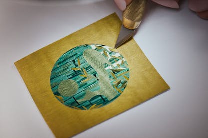 When Porchet began making paillonné enamel, no one had made paillons for over a hundred years (she scoured Europe for paillons to add to her collection) and they are extremely fussy to make and work with. Paillons are punched out of gold leaf, so first you have to make a punch, and once you’ve made the paillon, it’s so feather light it can only be manipulated with the end of an artist’s fine paint brush.
