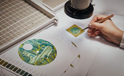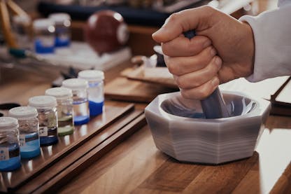 Traditional vitreous enameling involves grinding glass pigments into a very fine powder, which is then mixed with a binder before being applied to the work in progress. The enamelist judges the readiness of the powder from not only its appearance in the mortar and pestle, but also from the sound it makes as it breaks down.