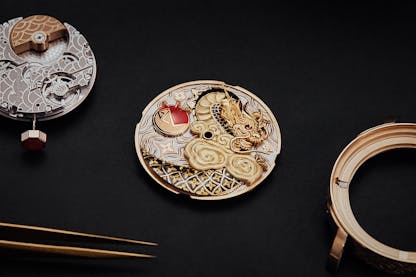 The body of the dragon is decorated with another rare type of enameling – paillonné. Paillonné enameling involves the setting of tiny spangles made of gold leaf, called paillons, onto the surface of the enamel before firing. Finally, a coating of fondant, or transparent enamel, is applied. The technique is demanding on several fronts. First of all, it almost died out completely in the 20th century and it was only thanks to the stubborn persistence of enamelists like Anita Porchet that it is part of the vocabulary of modern enamel dial watches today.