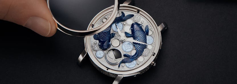 The Koi’s Garden watch depicts two koi, which is a collective term for different types of Japanese carp, bred for decorative purposes and thought to symbolize courage and resilience. The Koi’s Garden carp are sculpted out of white gold, which is kiln-fired to produce an oxide layer.