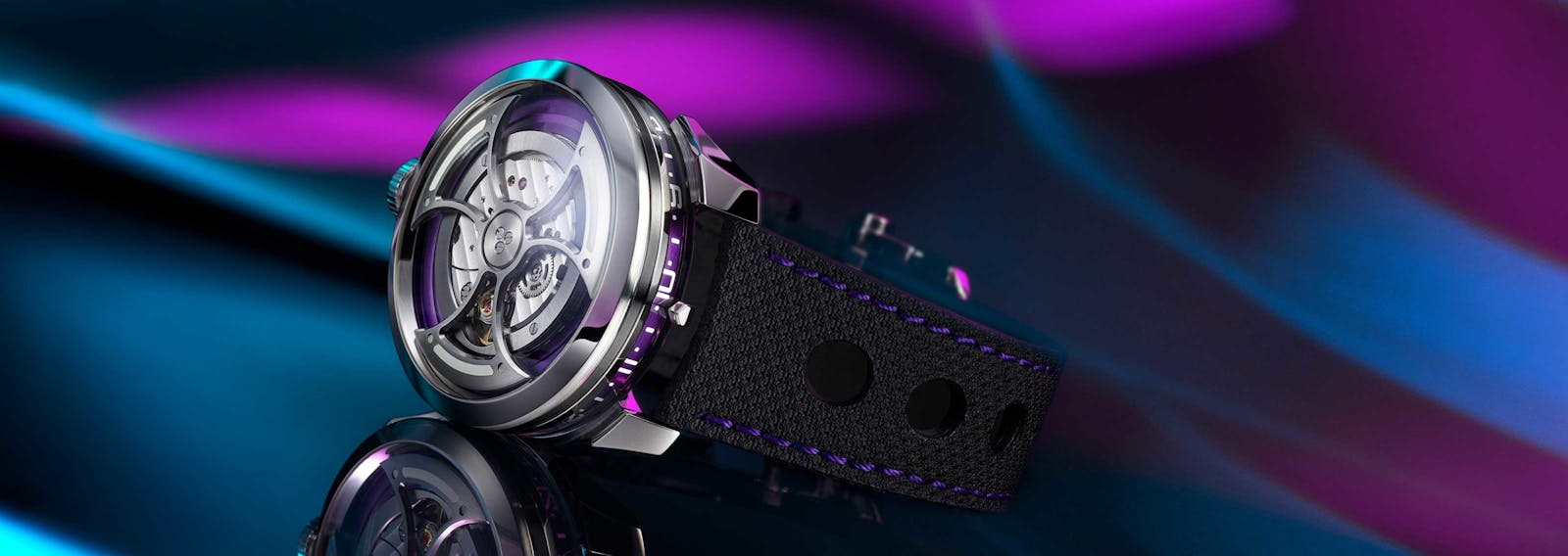 The M.A.D.1S: Case, 316L stainless steel, 42mm x 15mm, water resistance 30M; mineral glass back and domed sapphire front crystal with double-sided AR coating. Movement, Manufacture La-Joux Perret caliber G101, beating at 28,800 vph with 68 hour power reserve. Unidirectional winding (which makes for some very dynamic rotor rotation). Available to Friends (suppliers) and Tribe (MB&F collectors) in a limited series with purple accents; for the general public, ice-blue accents. 1500 piece first series; price, CHF 2900. To register interest and enter the lottery, visit the M.A.D. Gallery. You gotta be in it to win it.