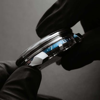Reading the time to within the minute isn’t really possible but at the same time, you can estimate it pretty closely – it’s around 7:35 or so in the image above. The idea of making a watch with a rotating ring for the hours that’s read via an aperture in the case has been used before – most notably, as far as I can recall, by Svend Andersen, in his Montre à Tact, which was introduced in 2015 – Andersen made a unique piece for Only Watch 2019 on this system, with an enamel case top showing Geneva’s famous landmark, the high-spouting foutain called the Jet D’Eau, which began life as a pressure release valve for a hydroelectric station. (We can’t all have Eiffel Towers, I guess).