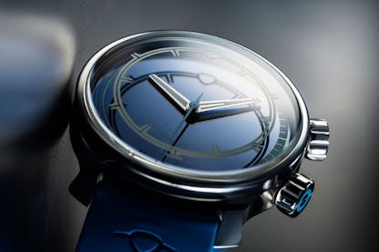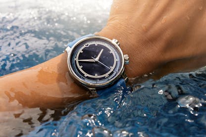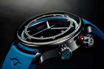 The Ming 37.09 Bluefin: case, 316L stainless steel, brushed and polished finishes, 38mm x 12.8mm, 44.5mm lug to lug, 20mm lug width; domed sapphire crystals front and back with double AR coating. Super-LumiNova X1 indexes on the the underside of the front crystal and on the blue metallized sapphire dial. Water resistance, 600M. Internal 60 click timer scale on unidirectional rotating dial via crown at 4:00. Movement, Sellita for Ming SW300.M1, anthracite skeletonized bridges and rotor with contrasting circular brushing; stop seconds; self-winding with 50 hour power reserve. Strap, FKM molded rubber, curved bars with quick release; “flying blade” tuck buckle with micro-adjustment. Price, CHF 4,950; 50% deposit required for order confirmation with deliveries beginning in October 2024. For more info and to order, visit Ming.watch.