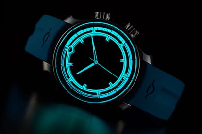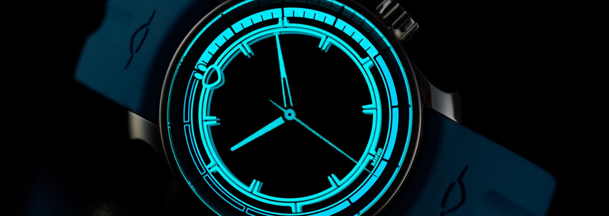 The almost total absence of a bezel gives a broad canvas for both the display of luminous material, and for the characteristic Ming inversion effects, where reflective surfaces can alternately appear opaque or completely transparent depending on the angle of the light. This combined with the layered use of luminous material gives the watch the constantly shifting visual effects typical of Ming watches.