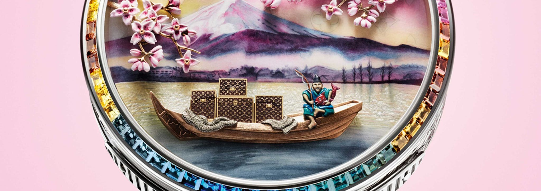 Ebisu is traditionally depicted wearing a tall hat, and holding a fishing rod, as well as a tai, or sea bream. On the front of the watch, Ebisu’s boat is seen laden with Louis Vuitton trunks, floating at dawn on a river in front of Mount Fuji (a mountain which needs no introduction). Above the scene, in the foreground, cherry blossoms can be seen and the bezel, which forms the frame for the image, is set with color-gradient rainbow baguette cut sapphires, whose colors match the transitions of colors in the image itself (pink sapphires, for instance, are adjacent to the pink sakura, or cherry blossoms).