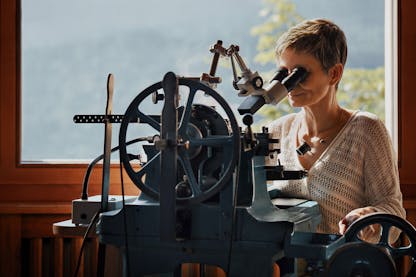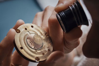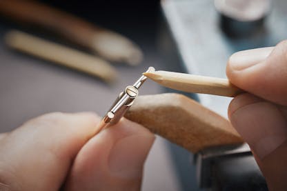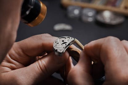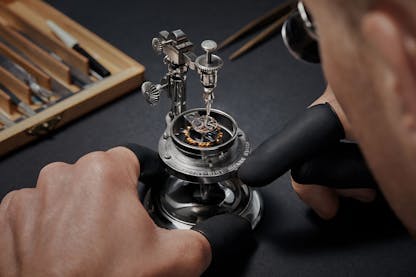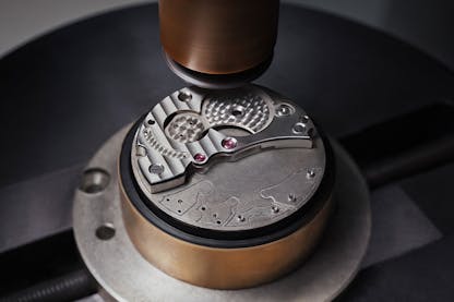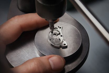 Zoom InApplying perlage to the underside of the train and mainspring barrel bridgeZoom InBalance bridge polishing with gentian pithwoodZoom InPolishing anglage on the movement bridge for the mainspring barrel and going train