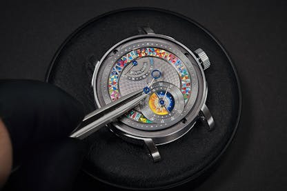 You work with a brush made of a single squirrel hair (I have been unable to find out what happens to the rest of the squirrel but presumably they are running happy and free in the woodlands around Geneva, blissfully unaware that they’re short one tail hair). The recesses are tiny and controlling the amount of paint applied, as well as getting it to fill the recess without overflowing, is an exercise that would tax the patient of a saint; I tried using some red paint and under the binocular microscope provided my attempt resembled nothing so much as a miniature crime scene. The precisely controlled gradients in the 24 hour dial are equally challenging to execute. If you look closely, by the way, you’ll see that the stars are tiny versions of the stars seen in the Louis Vuitton monogram pattern.