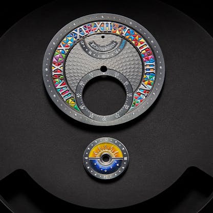 The rachet wheel, which fits onto the arbor of the mainspring barrel and which is wound from the crown via the crown wheel, is decorated with a colored geometric pattern echoing the miniature painting found on the dial.