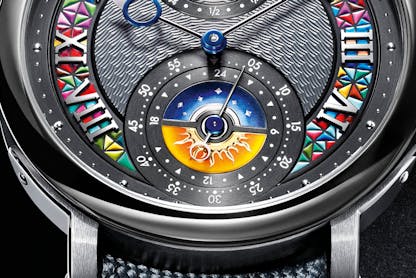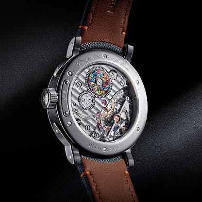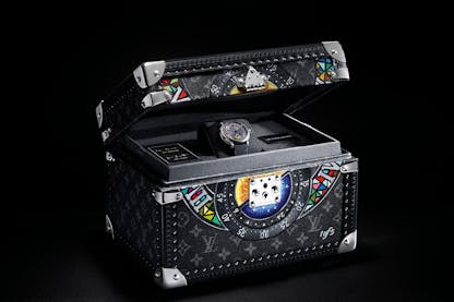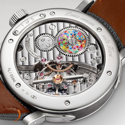 The Louis Vuitton X Kari Voutilainen, “Lous Cruises With Kari” LVKV-02 GMR 6: case, Escale, 52 components, 40.5mm x 12.54mm, water resistance 30M, with tantalum case middle and platinum caseback, bezel, lugs, and buckle. Dial, hand-guilloché decorated white gold with miniature painting done at La Fabrique du Temps; second time zone disc in 24K gold; hands, gold and heat blued steel. Movement, cal. GMR 6, with double escape wheels and “natural” escapement; 254 components running at 18,000 vph in 32 jewels; balance spring with outer Phillips and inner Grossmann terminal curves; white gold ratchet wheel with miniature painting. Monogram Eclipse watch trunk, hand painted. Limited edition of 5 pieces, price, €550,000. A portion of proceeds from the sale support the Louis Vuitton Prize For Independent Creatives. See Louis Vuitton’s watch collections at LouisVuitton.com.