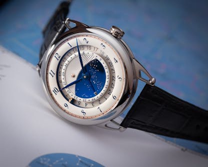 Two things immediately jump out at you when comparing the two watches – the first is the size. The standard DB25 SV GMT is 42mm x 11.8mm, which is a bit larger than a classic dress watch diameter of 37mm-39mm, but the larger diameter is an intrinsic part of the design, which has a 24 hour hand that doubles as a day/night indicator. The day/night indicator is essentially the same two-color, blued-steel-and-gold sphere De Bethune uses for its spherical moonphase, although in the latter case, the lighter hemisphere is in palladium. The sphere runs in a cut-out track set into the dial, going around once per day. The Louis Varius, on the other hand, is a noticeably larger watch, at 45mm x 14.05mm but there is a very good reason for the extra millimeters, which we’ll get to in a minute.