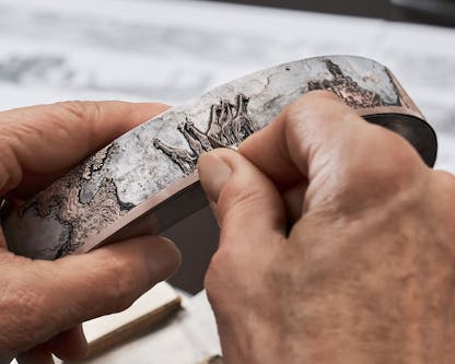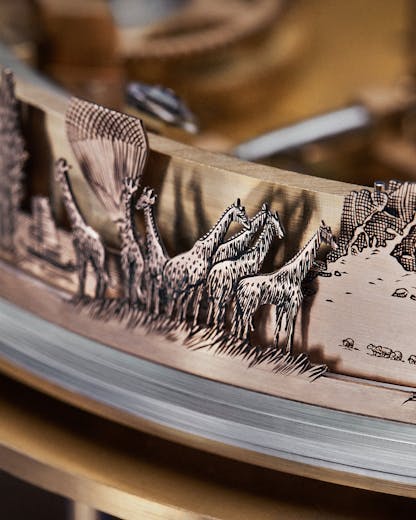 The engravings are based on drawings by the Belgian artist and graphic novel illustrator, François Schuiten, who is best known for the series, “The Obscure Cities,” which show stories that take place in imaginary, science-fiction cities with architecture and landscapes partly informed by conventional scifi tropes, but also by elements of steampunk and other alternative history genres. The scenes Shuiten produced for this project draw on an idealized vision of 19th century travel, in keeping Louis Vuitton’s history and the overall theme of the project, which is centered around a GMT complication.