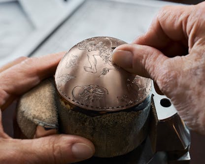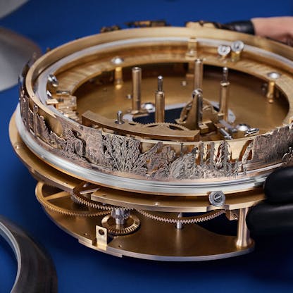 It’s elaborately decorated but it manages to be so without becoming too Rococo for its own good – I think another company might have been tempted to add engraving or other ornamentation to the gimbal system, which I think looks pleasingly architecturally clean; a fine and fairly rare example of knowing when to stop. The ring on the base is meteorite, heat-tempered blue at De Bethune, and the hemisphere inside the gimbals contains the clock proper, as well as the cradle for the watch, which is located under the central dome. The dome, as well as the ring of engraved travel scenes around the periphery of the hemisphere, are 5N rose gold, and are decorated with engravings by the engraver, Michéle Rothan (you can see her, and some of her work, in this video from Watches & Wonders 2017).