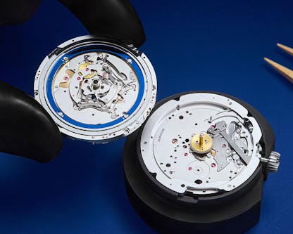 The winding system is designed to use the crown almost as if it were a screw, and the clock, a screwdriver. The crown has a cutout in it, in the shape of a Louis Vuitton Monogram flower. When the watch is placed in its dock, a matching bit fits inside the cutout, and winds the watch, propelled by the gear train of the clock. The cutout and the bit appear to have been machined in such a way as to ensure a tight fit and clean engagement when the watch is inserted into the clock, without leaving marks or scratches on either the bit or the crown.