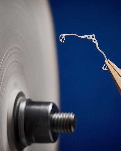 The bit is mounted on two spring loaded rods, to allow it to move freely backwards and forwards. Similarly to the THA Sympathiques, the crown has a co-axial pusher (a little difficult to see, as it’s set flush with the recessed inner surface of the flower cut-out) and when it’s pushed inward, a lever inside the watch attached to the crown, changes the position of the minute hand to match that of the clock. Breguet used a system of pawls to adjust the position of the minute hand wheel; the system is concisely described by Revolution’s Cheryl Chia in an article from May of this year.