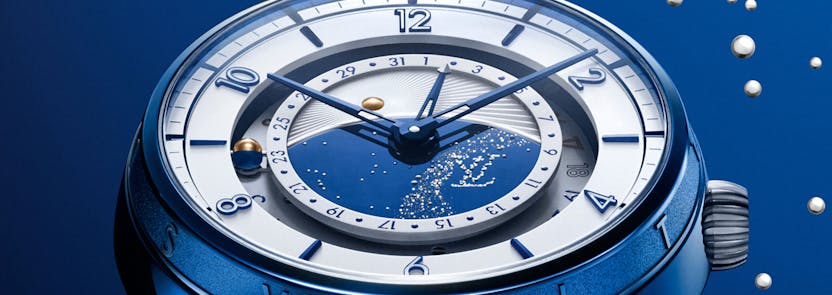 The LVDB-03 Louis Varius: case, Tambour Taiko in blued titanium; lugs and crown in platinum, 53 components; the case hand polished and heat tempered blue, 45mm x 14.05mm, lug-to-lug 21mm, 20 meter water resistance; sapphire crystals front and back. Dial, 12 hour local time disk; second time zone disk with spherical rose gold and blued steel sphere; central dial in blued titanium with ‘Louis Vuitton’ constellation with 18k white gold pins and gold leaf. Brass blue PVD hour and minute hands; blue PVD date hand with silvered arrow.