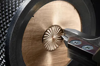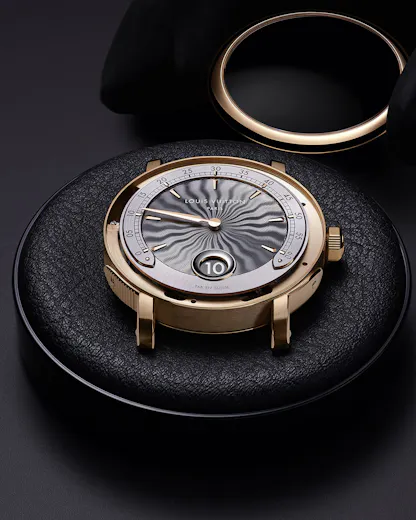 The dial of the watch is what appears to be a quite thick disk of metal (the material is not specified by Louis Vuitton, although gold or brass would both work from a machining standpoint) and is quite three dimensional, with a raised sector for the retrograde minutes, and an almost amphitheater-like window for the hours. The guilloché pattern is what’s called flammé – flame, for obvious reasons – and the dial is a quite stately and suitably ornate stage setting for the jump hour and retrograde minute complications.