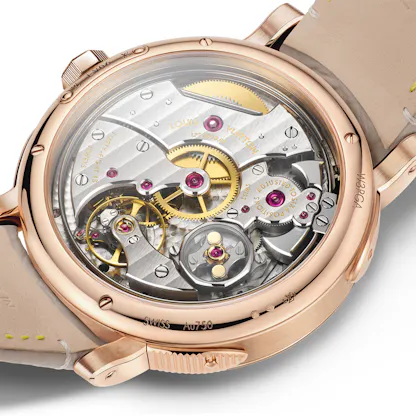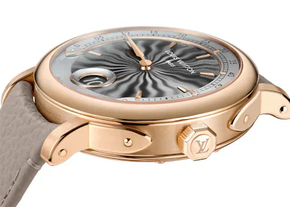 The Louis Vuitton Escale Minute Repeater: case, 40mm x 12.3mm, rose gold, with sapphire crystals front and back; water resistance, 50M. Dial, hand guilloché; 18k rose gold minute hand and indexes. Movement, caliber LFT SO13.01, running at 21,600 vph in 48 jewels, 80 hour power reserve. Minute repeater with retrograde minutes and jumping hours. Price, $350,000.