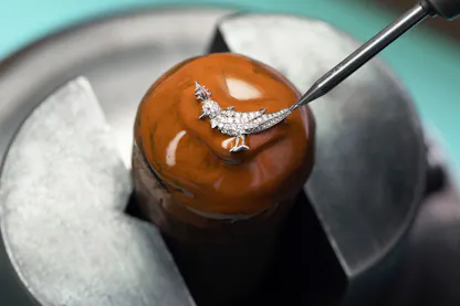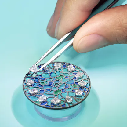 For the Wisteria watch, a relatively rare type of enameling known as plique-à-jour was used, which is essentially a miniature form of stained glass. It’s considered technically more challenging as unlike other types of enameling, there is no metal backing. This allows the light to shine through the enamel but also requires great care on the part of the enamelist.