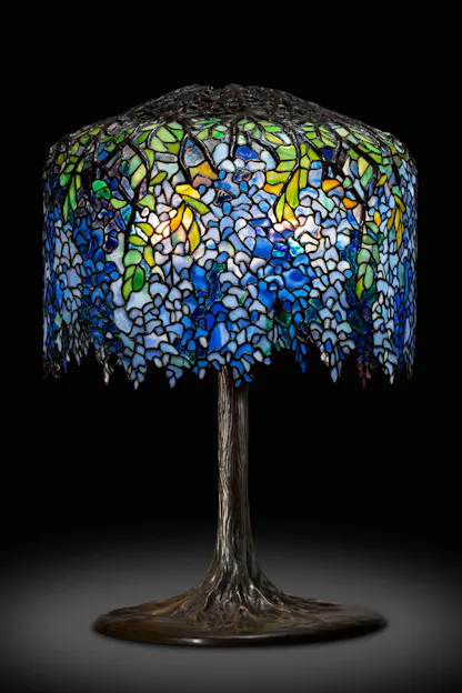 Tiffany fans will almost certainly already be familiar with Tiffany’s famous “Wisteria” table lamp, which was designed by the celebrated Tiffany glass artist Clara Driscoll (1861-1944) who designed over thirty lamps for Tiffany, and who was the head of the Tiffany Studios Women’s Glass Cutting Department. The Wisteria lamp required the hand cutting and setting of some 2,000 pieces of glass and, five years after its introduction in 1901, the Wisteria lamp sold for $400, which was a year’s salary for the average American worker; it was one of Tiffany’s most expensive lamps Tiffany sold.