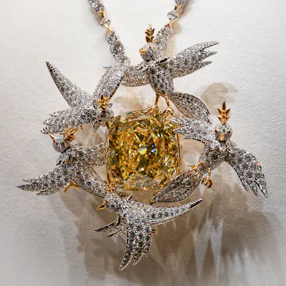 The “Bird On A Rock” brooch is one of Schlumberger’s most famous design for Tiffany & Co. and was inspired by a yellow cockatoo Schlumberger saw outside his home in Guadalupe. Over the years, there have been many versions of the design, including one that saw the bird perched atop the “Tiffany Yellow” diamond, one of the largest yellow diamonds in the world, which is still owned by Tiffany and which has since its discovery in 1877, been worn by only four women: Mary Whitehouse (at the 1957 Tiffany Ball) Audrey Hepburn in 1961, in the marketing campaign for “Breakfast At Tiffany’s” and then by Lady Gaga and Beyoncé.