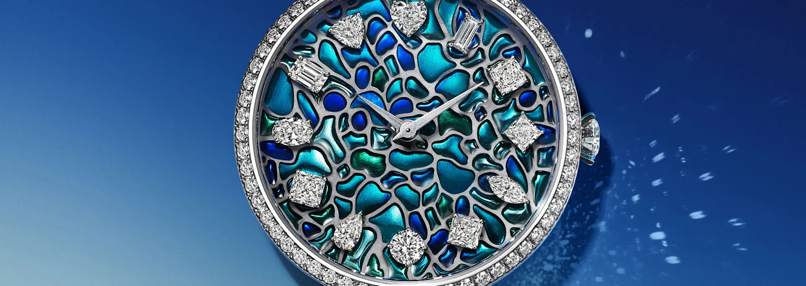 Each of the hour markers uses a different diamond cut: round brilliant, baguette, cushion, Tiffany True®, marquise, Asscher, heart, pear, oval, emerald, triangle and princess.