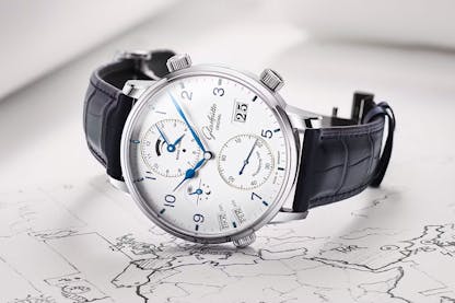 Actual attempts to mechanically cope with DST are few and far between. One very unusual example is Glashütte Original’s Senator Cosmopolite; the watch has a home time display in a subdial at 12:00 and a central display of local time. The watch is not a world timer in the narrow sense but it is a GMT/Dual Time Zone watch with a couple of cool party tricks. The first is that the local time hour hand can be jumped forwards or backwards in fifteen minute intervals which means that unlike just about every other GMT watch out there, you can set local time to all 37 time zones, even the ones with non-full hour offsets from GMT.