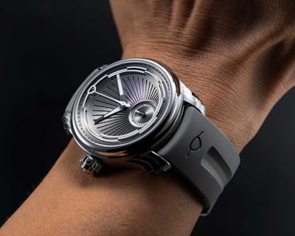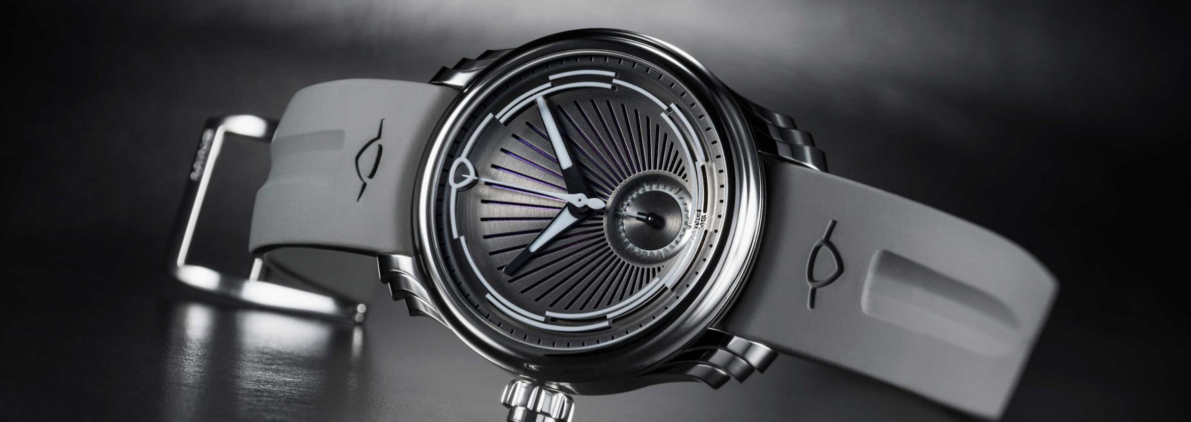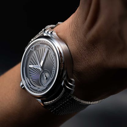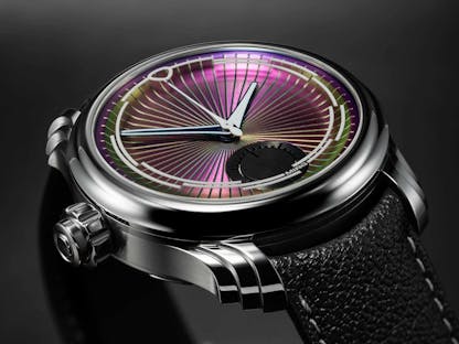 The Phoenix has essentially the same design elements as its predecessor, including the 40mm stainless steel case, three-step lugs, deeply dished dial, and crown-left monopusher configuration. However, where the Iris was an exploration of chromatic exuberance, the Phoenix offers a more restrained interpretation of the design. Most notably, the multiphasic coating has been moved to a plate underneath the main dial, which has radial cutouts allowing the color shifts to be seen – the effect is rather like seeing an ornamental carp in a pond, swimming far enough below the surface to be visible through intermittent flashes of color.