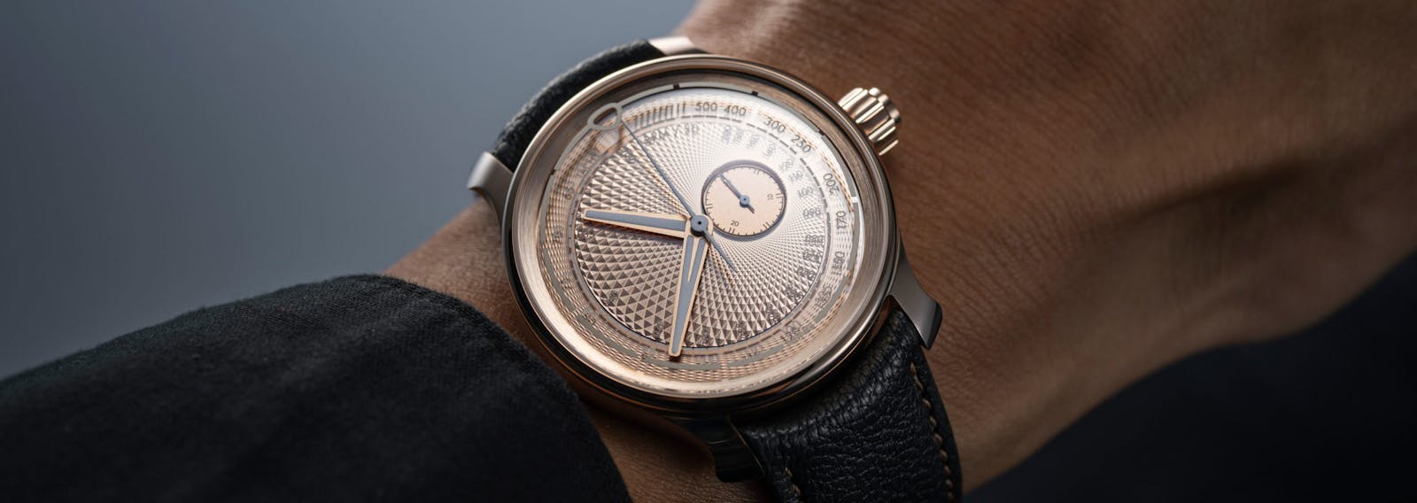 The dial is made by Comblemine, the dial manufacturer owned by Kari Voutilainen, and the guilloché pattern has been executed with a CNC machine as, according to MING, the desired depth of the cuts could not be produced with a traditional rose engine (another example of using modern materials and methods in support of an effect not quite reproducible with traditional means). This is all the more true thanks to the complex dial construction, which consists of an SLN-filled sapphire dial over the gold dial underneath. While the application of Super-LumiNova X1 is the same as in the original 37.04, it gives a slightly different effect against the rose gold dial and case – the green seems a bit warmer and even a bit more vital against the gold background and gains in organic, almost chlorophyll-like saturation what it loses in post-modernity.